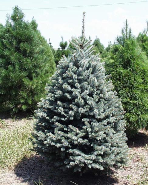 | Blue Spruce: A Colorado Blue Spruce has a nice pyramidal shape with strong limbs that can hold heavy ornaments. The Blue Spruce is known for its lovely blue foliage which can also appear silvery. |
